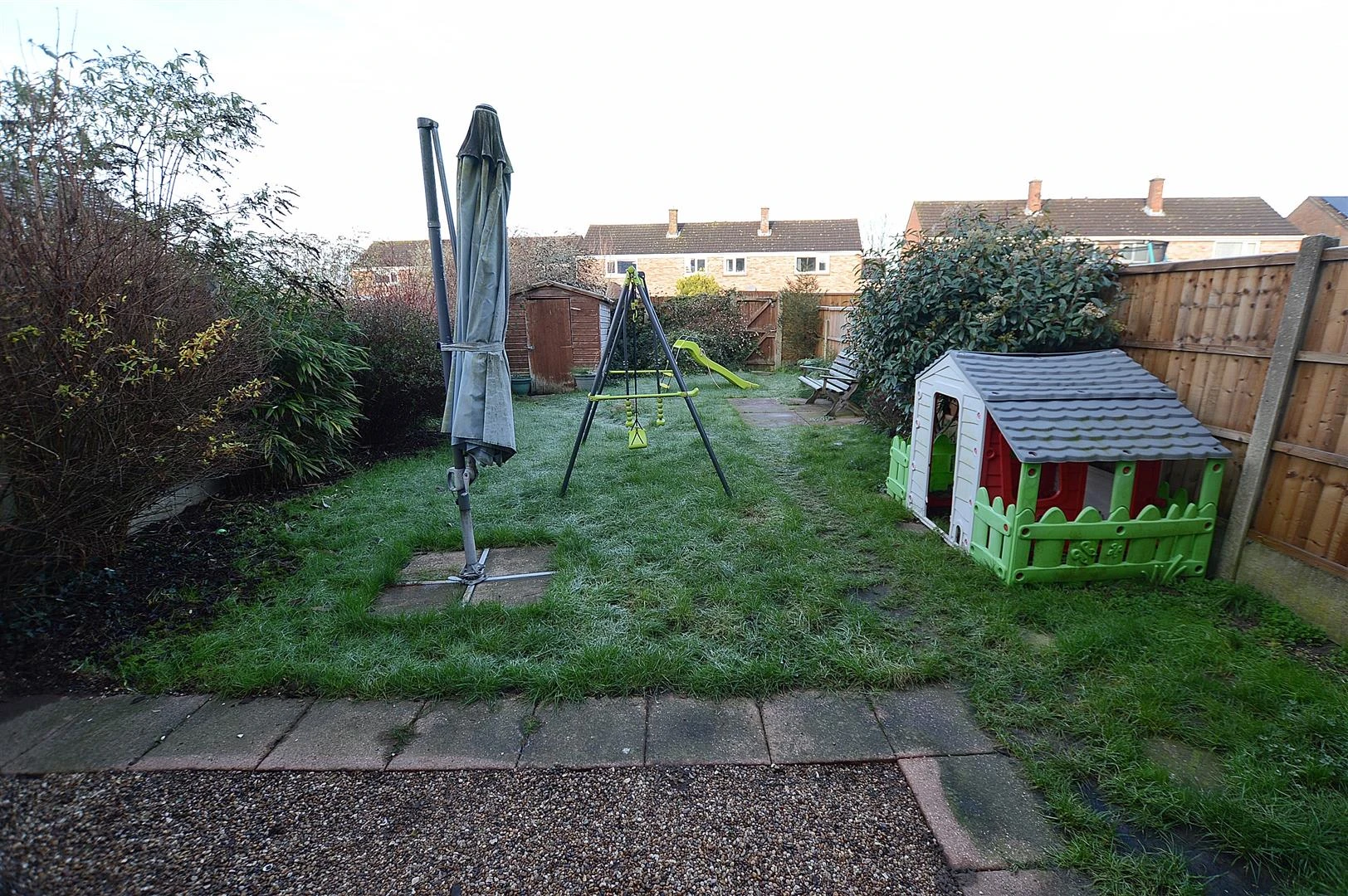 Enclosed rear garden with lawn, paved patio and timber garden shed