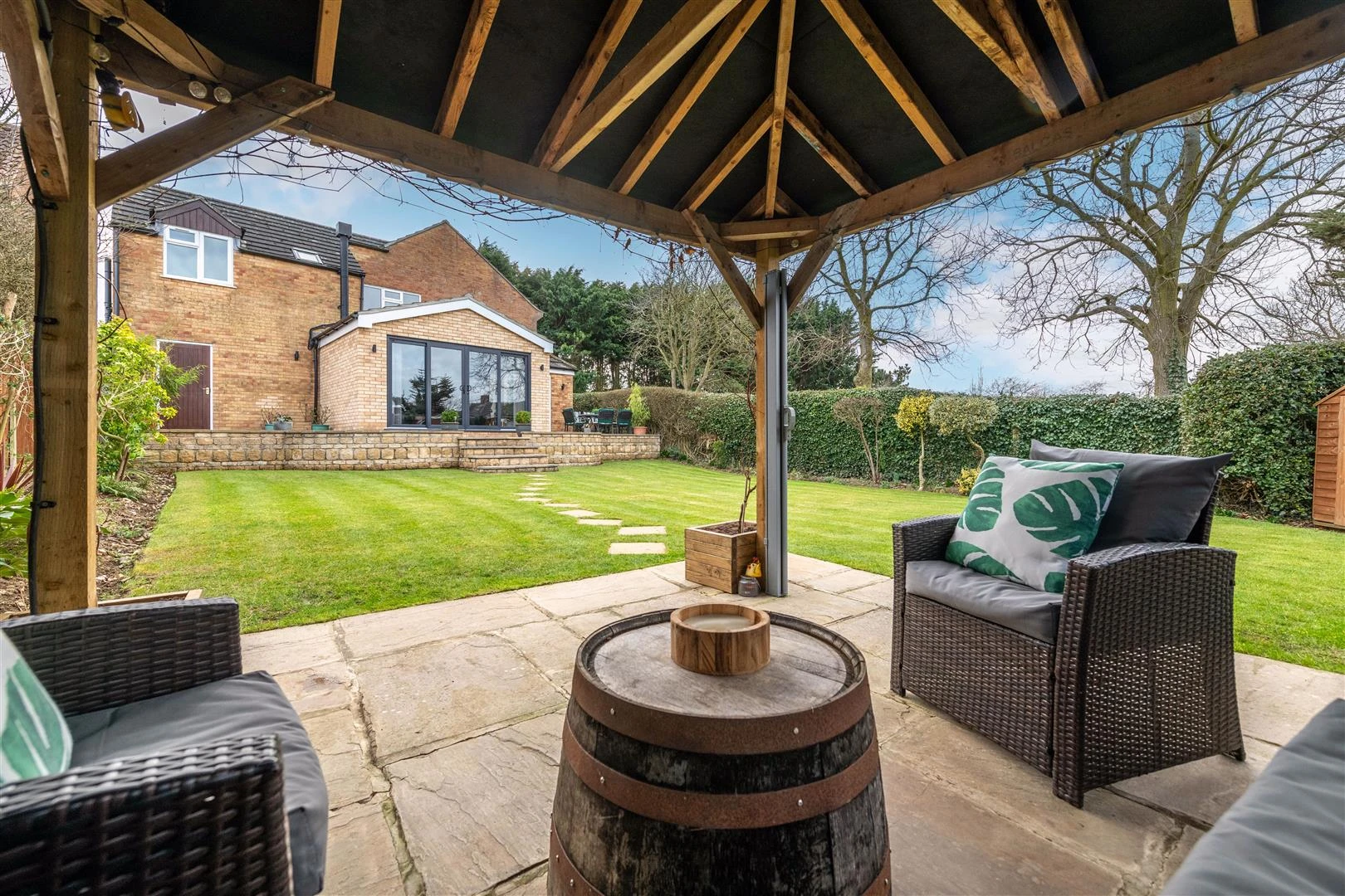 0.13 acre (sts) grounds with delightful stepped terrace to lawn, covered pergola seating