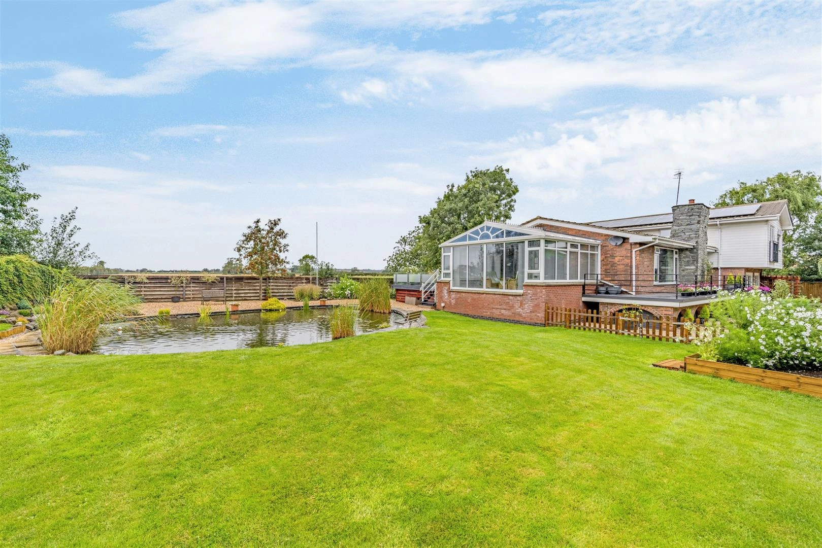 Sweeping lawns and attractive pond